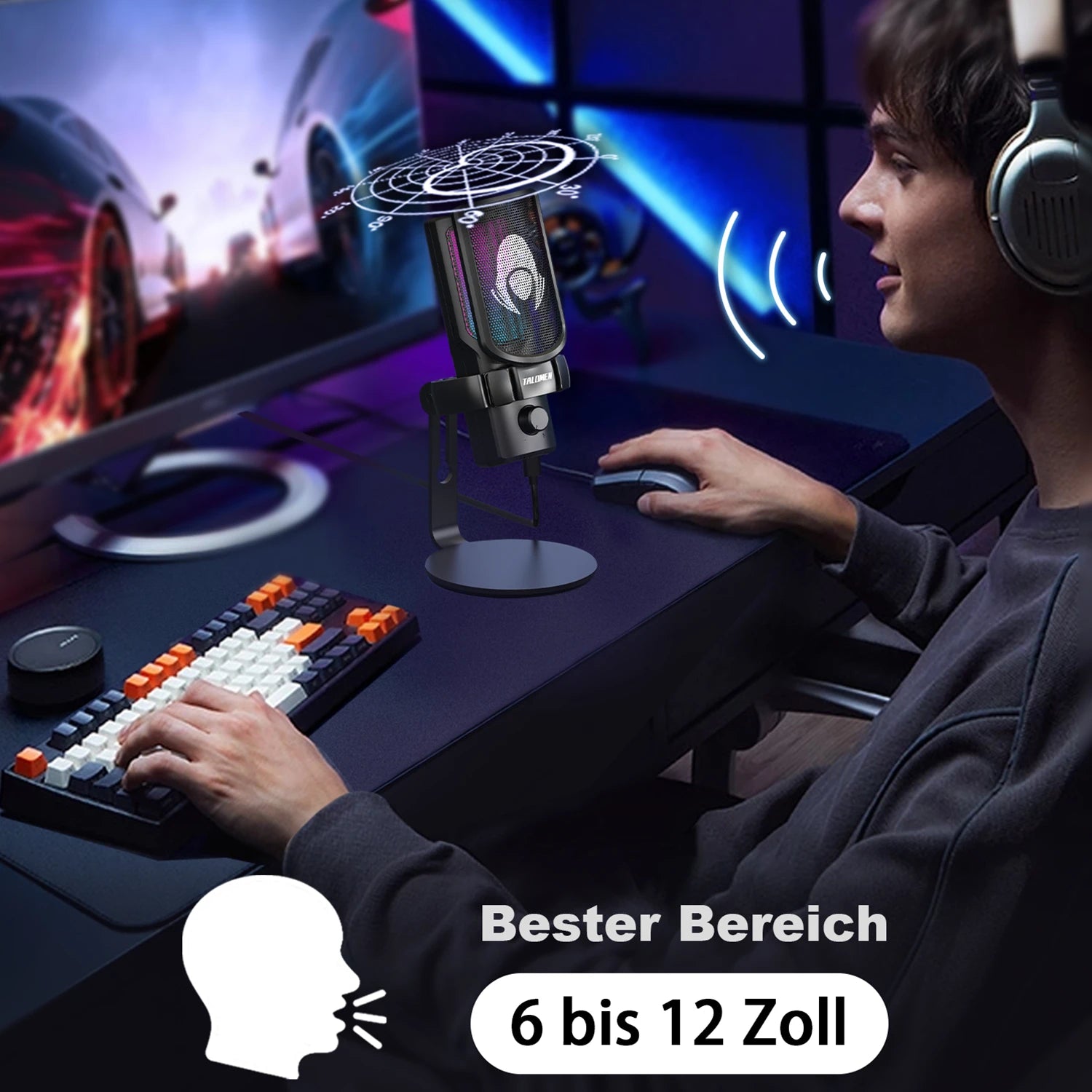 Das Talomen Eyas-Mikrofon ist ein für PC-Gamer entwickeltes Streaming-Mikrofon mit Nierencharakteristik, das sich auf die Haupttonquelle konzentriert und Ihre Stimme sogar in lauten Umgebungen aufnimmt, sodass Sie präzise mit Ihren Gaming-Partnern kommunizieren können.
