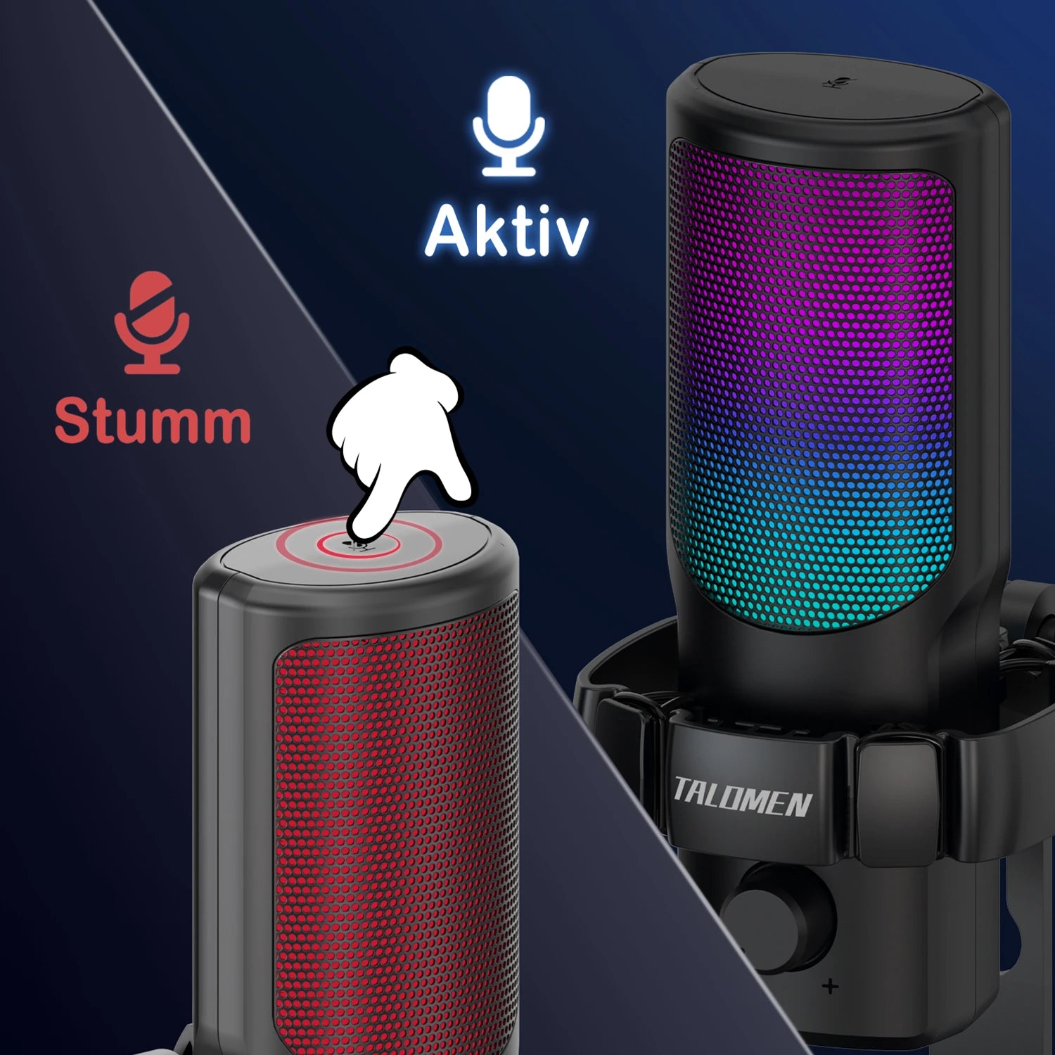Das Talomen USB-Gaming-Mikrofon verfügt über eine lebendige RGB-Beleuchtung mit sieben Farbmodi, die eine immersive Gaming-Atmosphäre schafft. Dieses Gaming-Studiomikrofon verfügt über eine berührungsempfindliche Schnellstummschaltung; ein einfaches Tippen schaltet das Mikrofon stumm, sodass Sie immer wissen, wann es stummgeschaltet ist, und so unerwartete Unterbrechungen während Streams oder Spielen vermeiden.