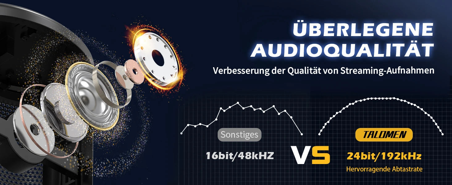 Im Vergleich zu anderen Produkten desselben Typs verfügt das USB-Mikrofon von Talomen Eyas über eine bessere Abtastrate für die Tonqualität, was die Qualität des von Ihnen übertragenen Tons deutlich verbessern kann.