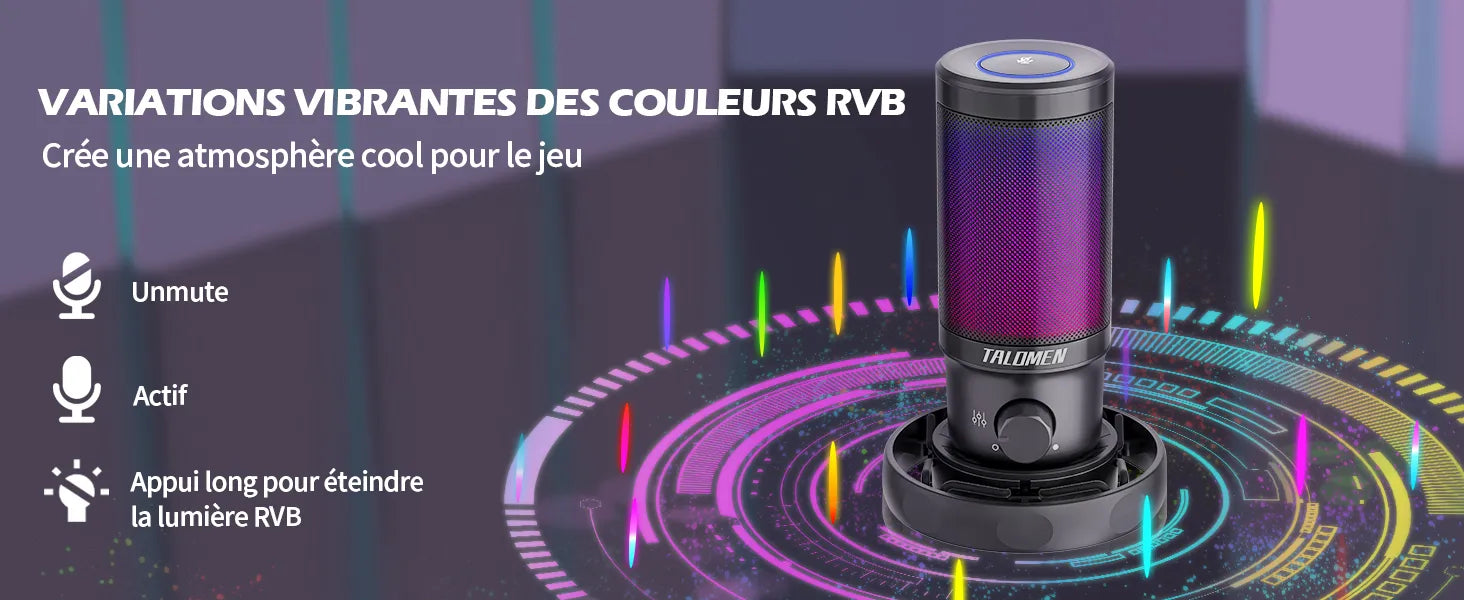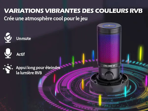 Les changements de couleur RVB vous permettent de vous immerger automatiquement dans des effets de jeu spéciaux. Le bouton de sourdine à touche rapide sur le dessus vous aide à couper le microphone en une seconde. Rappelez-vous l'état de fonctionnement, le RVB s'éteint lorsque le microphone est coupé (le RVB n'est pas réglable lorsque le microphone fonctionne). Pas besoin de s'inquiéter du crash audio lors du streaming.