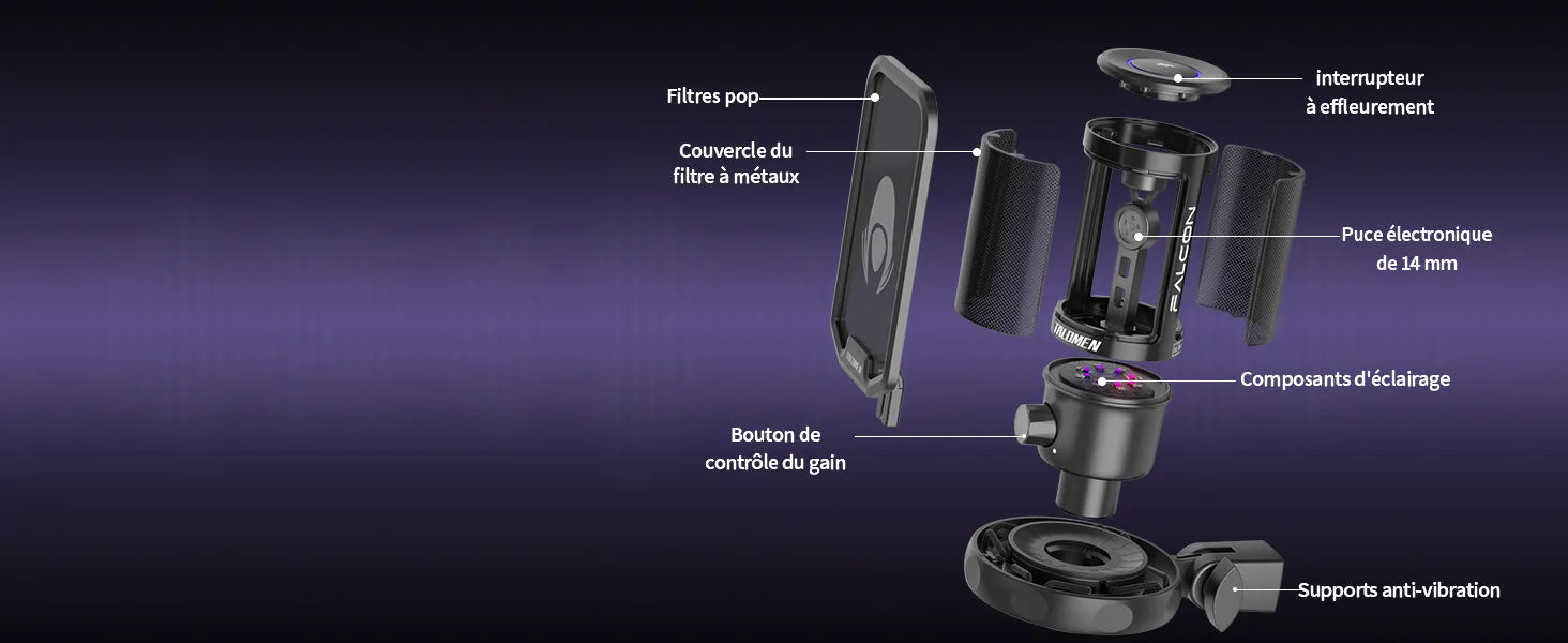 Le kit de microphone USB pour PC de jeu Talomen Falcon comprend 1 support de microphone pour PC avec support antichoc, 1 filtre anti-pop, 1 support de bureau avec adaptateur, 1 câble USB de 2 m (6,5 pieds) et 1 manuel d'utilisation. Emportez-le à n'importe quelle occasion de travail ou de divertissement et commencez à vous amuser.