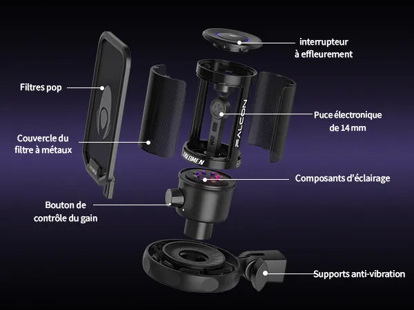 La bande élastique en caoutchouc est solidement fixée au support antichoc pour réduire le bruit de vibration causé par les tapotements intenses du clavier et les clics de la souris. Le filtre anti-pop amovible est solidement fixé au microphone du PC de jeu pour aider à éliminer le bruit généré par vos mots passionnants dans le jeu. La base du disque métallique empêche le microphone du podcast de bouger lorsqu'il touche le bureau pendant les jeux intenses.
