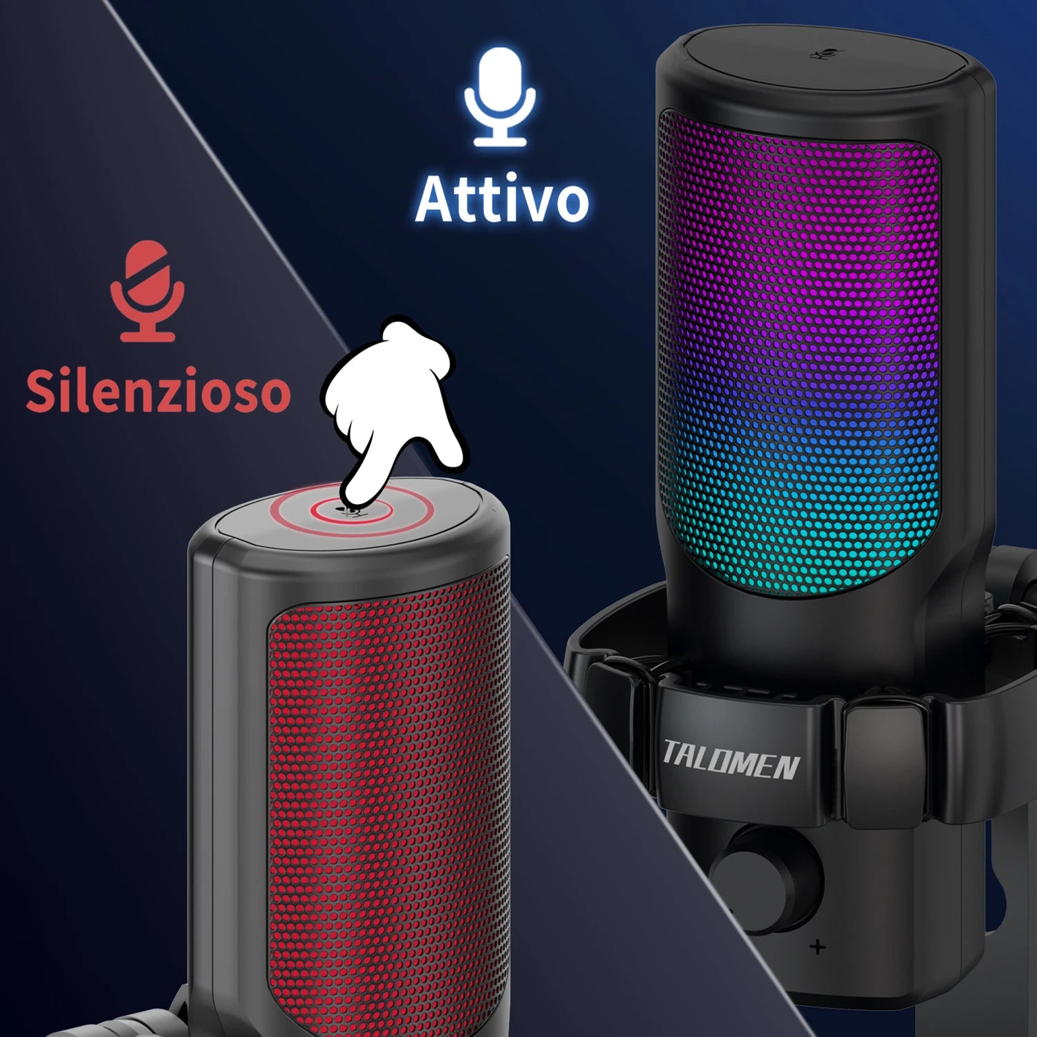 Il microfono da gioco USB Talomen è dotato di un'illuminazione RGB vibrante con sette modalità colore, creando un'atmosfera di gioco immersiva. Questo microfono da gioco da studio include un silenziamento rapido sensibile al tocco; un semplice tocco disattiva il microfono, così sai sempre quando è disattivato, aiutando a evitare interruzioni impreviste durante lo streaming o i giochi.