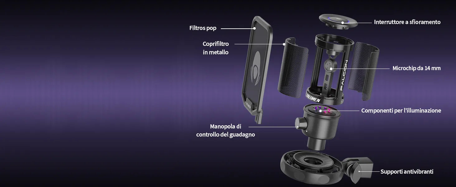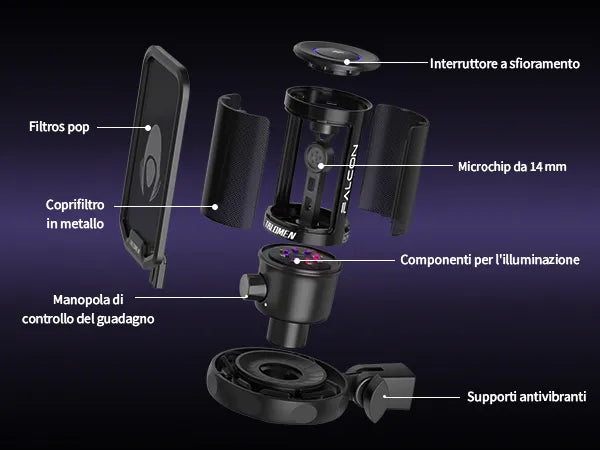 Il set di microfoni USB per PC da gioco Falcon Stand include 1 supporto antiurto*1, 1 filtro anti-pop*1, supporto con braccio girevole con adattatore*1, cuffie con jack da 3,5 mm ad alta sensibilità*1, cavo USB da 6,5' (2 m)*1, morsetto a C*1 e manuale utente Include *1. 2) Il supporto per microfono RGB si fissa saldamente a scrivanie spesse fino a 2 pollici.