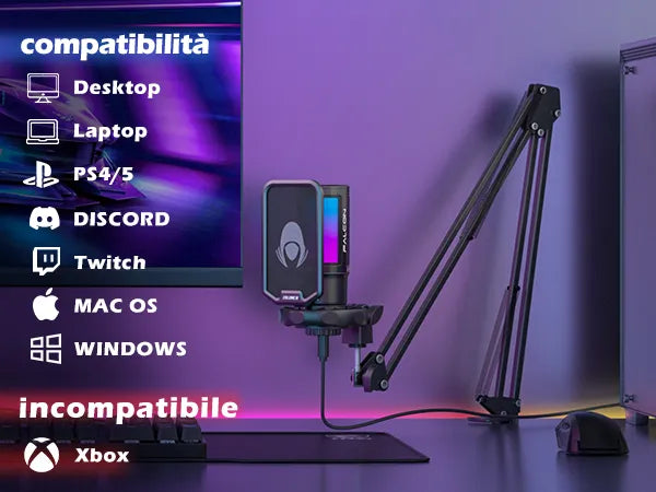 Non sono necessari plug-in aggiuntivi o complicati passaggi di configurazione del dispositivo, compatibile con Windows, Mac e PS4 PS5. L'estremità del microfono è un'interfaccia di tipo C, reversibile, nessun problema per collegarla nel modo giusto in un'atmosfera di gioco buia. Il cavo USB da 2,5 m è abbastanza lungo da estendersi dal retro dell'host al desktop per la registrazione audio.