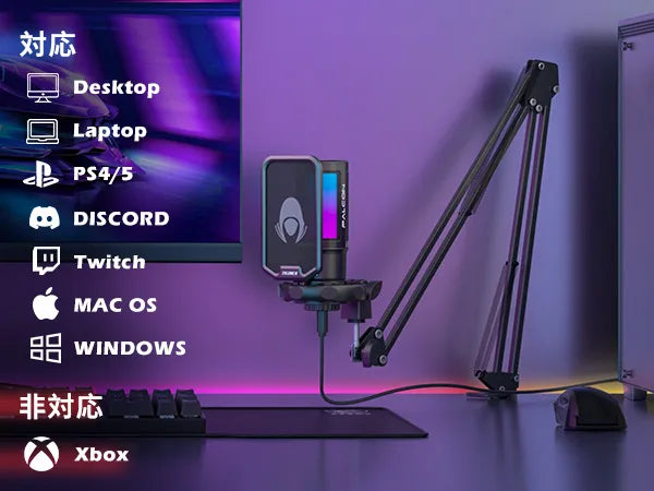 追加のプラグインや複雑なデバイス設定手順は不要で、Windows、Mac、PS4 PS5と互換性があります。マイクの端はタイプCインターフェースで、リバーシブルなので、暗いゲームの雰囲気でも正しく差し込むことができます。2.5mのUSBケーブルは、ホストの背面からデスクトップまで伸ばしてオーディオを録音するのに十分な長さです。